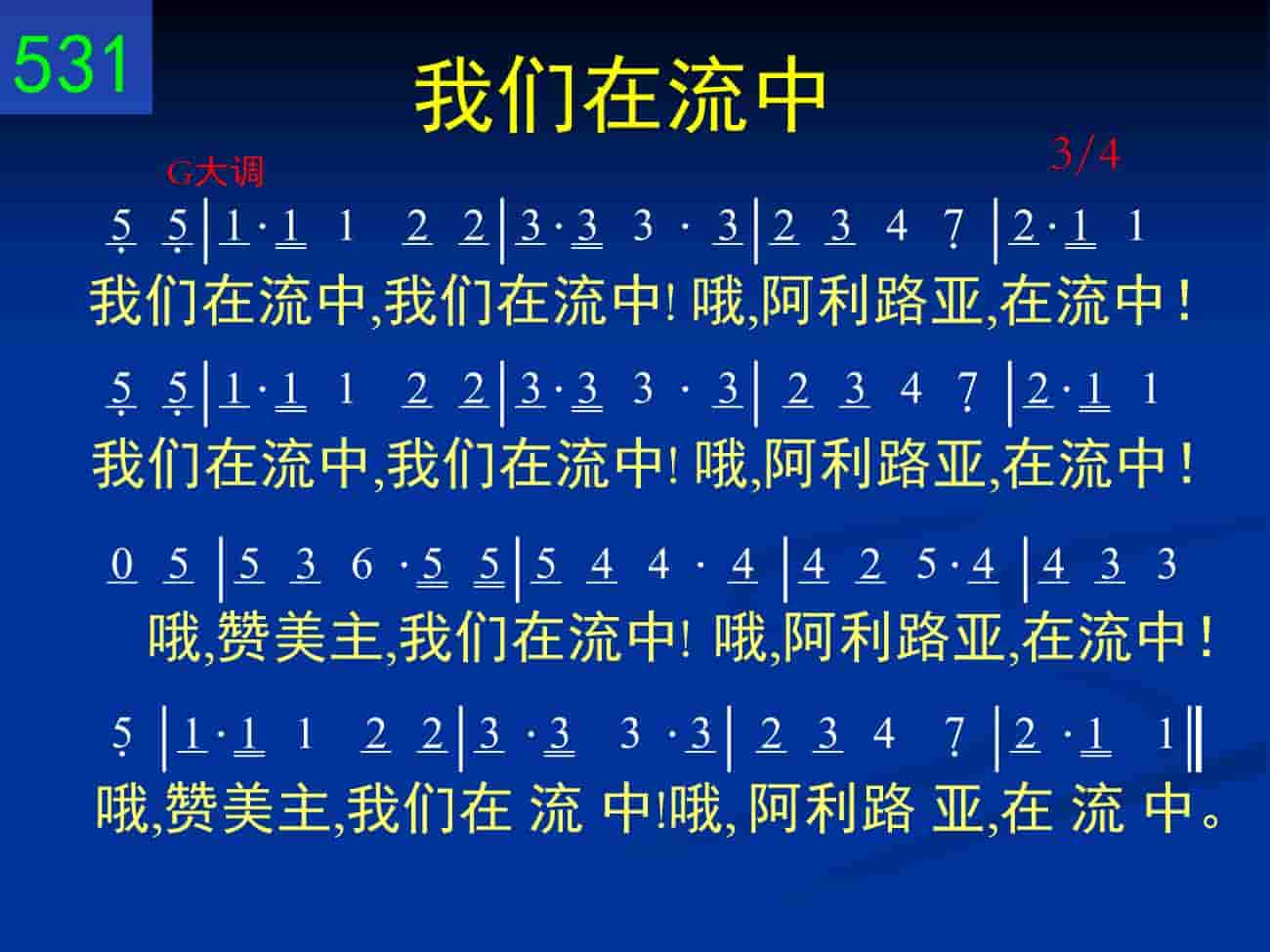 我们在流中,我们在流中!哦,阿利路亚,在流中!(二遍)哦,赞美主,我们在流中!哦,阿利路亚,在流中!哦,赞美主,我们在流中!哦,阿利路亚,在流中。