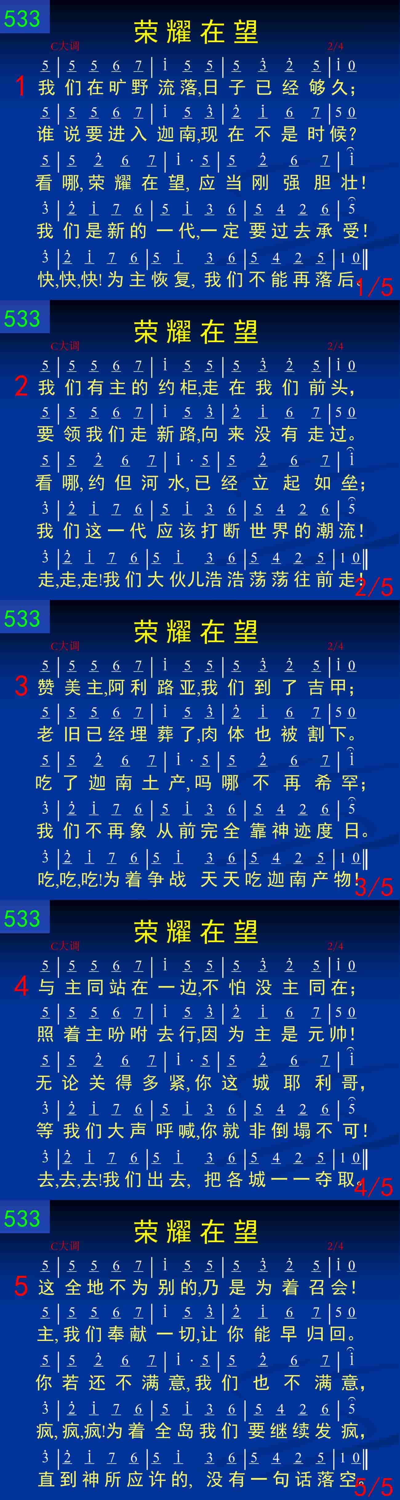 我们在旷野流落,日子已经够久;谁说要进入迦南,现在不是时候?看哪,荣耀在望,应当刚强胆壮!我们是新的一代,一定要过去承受!快,快,快!为主恢复,我们不能再落后。