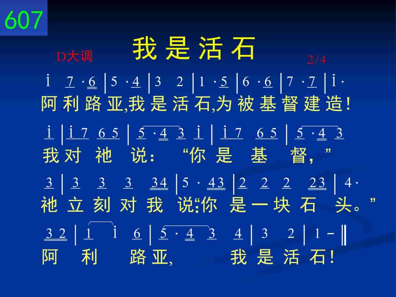 阿利路亚,我是活石,为被基督建造!我对祂说:“你是基督,”祂立刻对我说,“你是一块石头。”阿利路亚,我是活石!