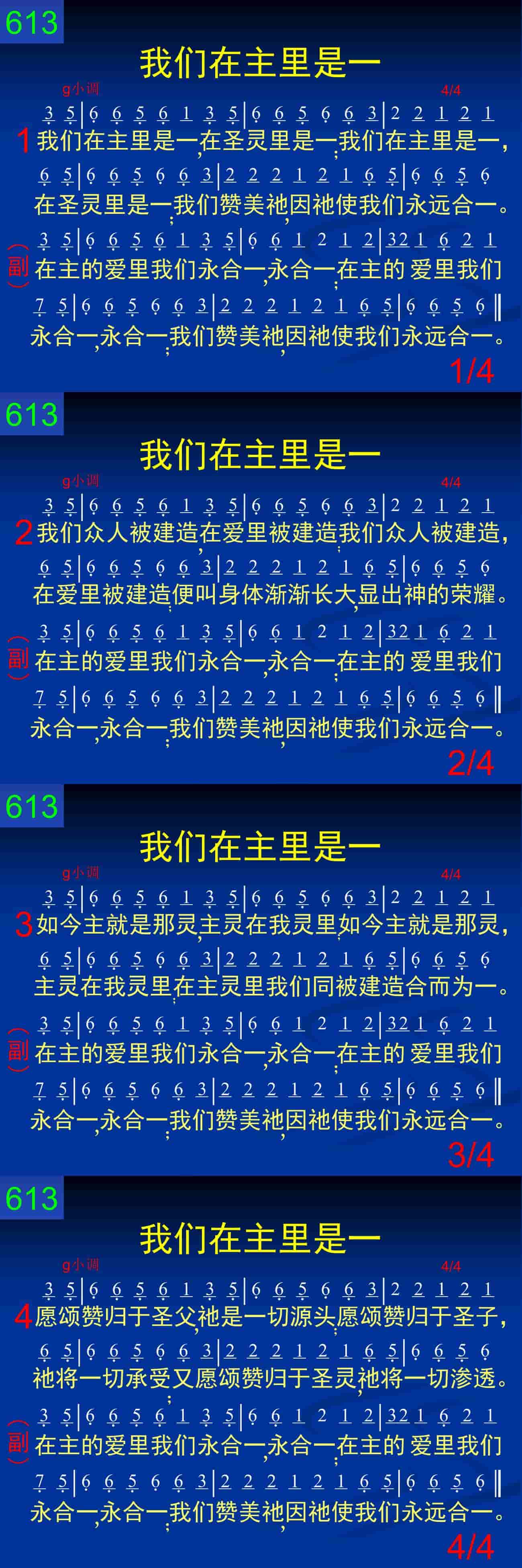 我们在主里是一,在圣灵里是一;我们在主里是一,在圣灵里是一;我们赞美祂,因祂使我们永远合一。