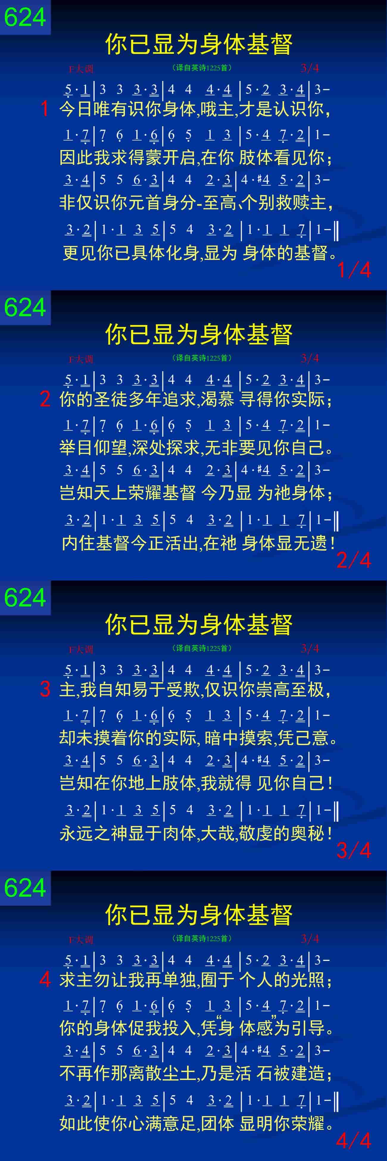 你的圣徒多年追求,渴慕寻得你实际;举目仰望,深处探求,无非要见你自己。岂知天上荣耀基督今乃显为祂身体;内住基督今正活出,在祂身体显无遗!