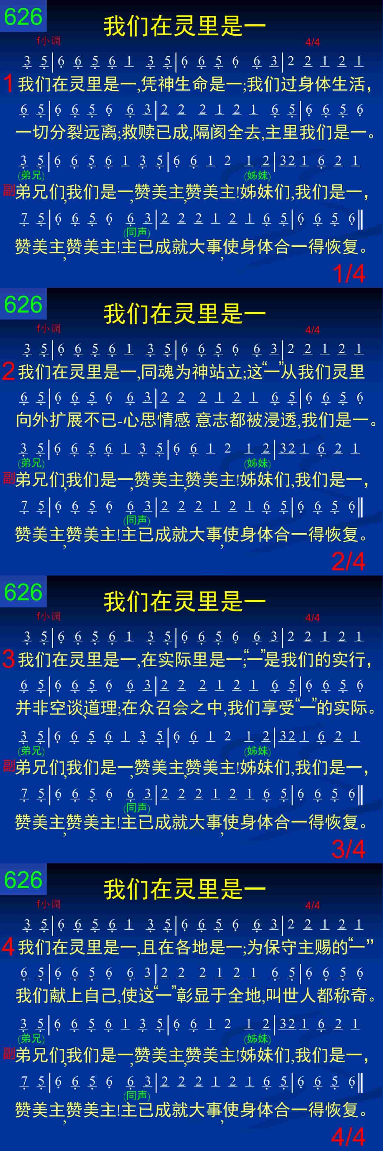(弟兄)弟兄们,我们是一,赞美主,赞美主!(姊妹)姊妹们,我们是一,赞美主,赞美主!(同声)赞美主,赞美主!主已成就大事,使身体合一得恢复。