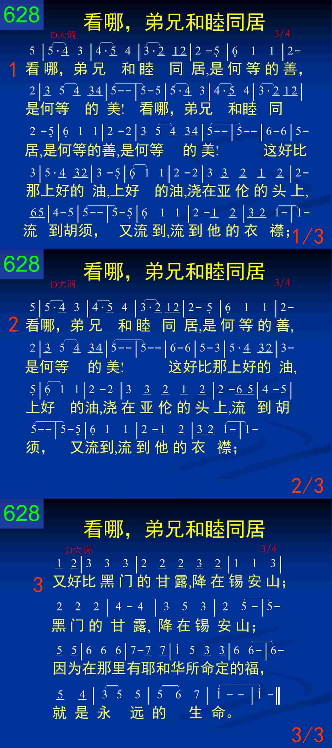 看哪,弟兄和睦同居,是何等的善,是何等的美,看哪,弟兄和睦同居,是何等的善,是何等的美,这好比那上好的油,上好的油,浇在亚伦的头上,流到胡须,又流到他的衣襟;