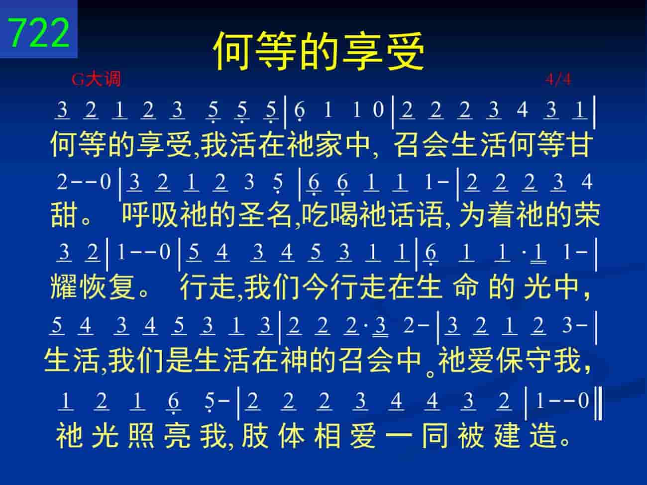 何等的享受,我活在祂家中,召会生活何等甘甜。呼吸祂的圣名,吃喝祂话语,为着祂的荣耀恢复。行走,我们今行走在生命的光中,生活,我们是生活在神的召会中。祂爱保守我,祂光照亮我,肢体相爱一同被建造。