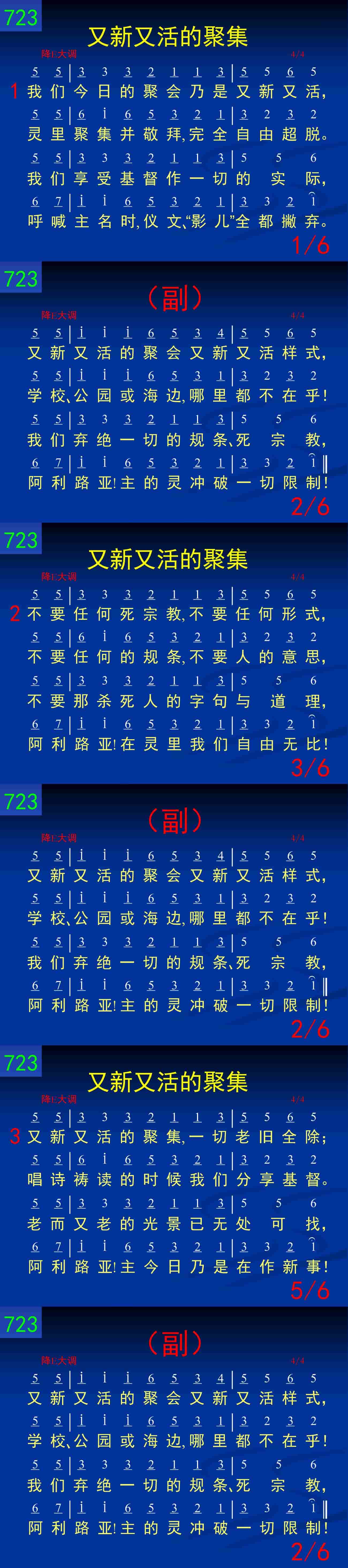 又新又活的聚集,又新又活样式,学校、公园、或海边,那里都不在乎!我们弃绝一切的规条、死宗教,阿利路亚!主的灵冲破一切限制!