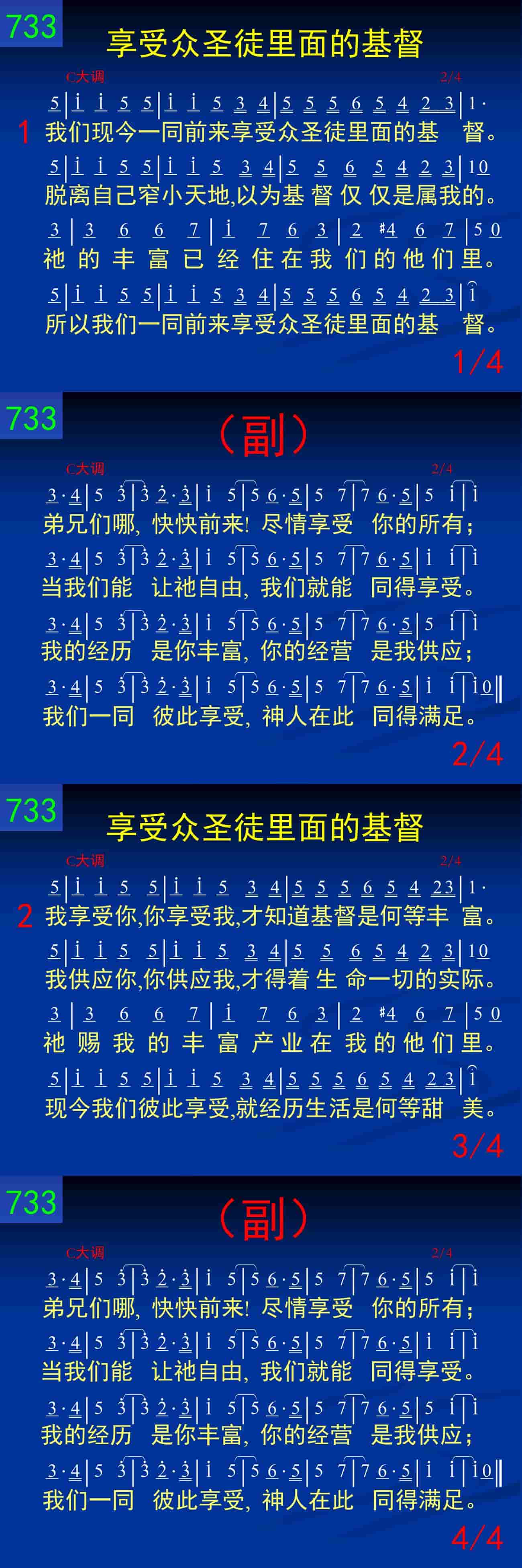 我享受你,你享受我,才知道基督是何等丰富。我供应你,你供应我,才得着生命一切的实际。祂赐我的丰富产业在我的他们里。现今我们彼此享受,就经历生活是何等甜美。