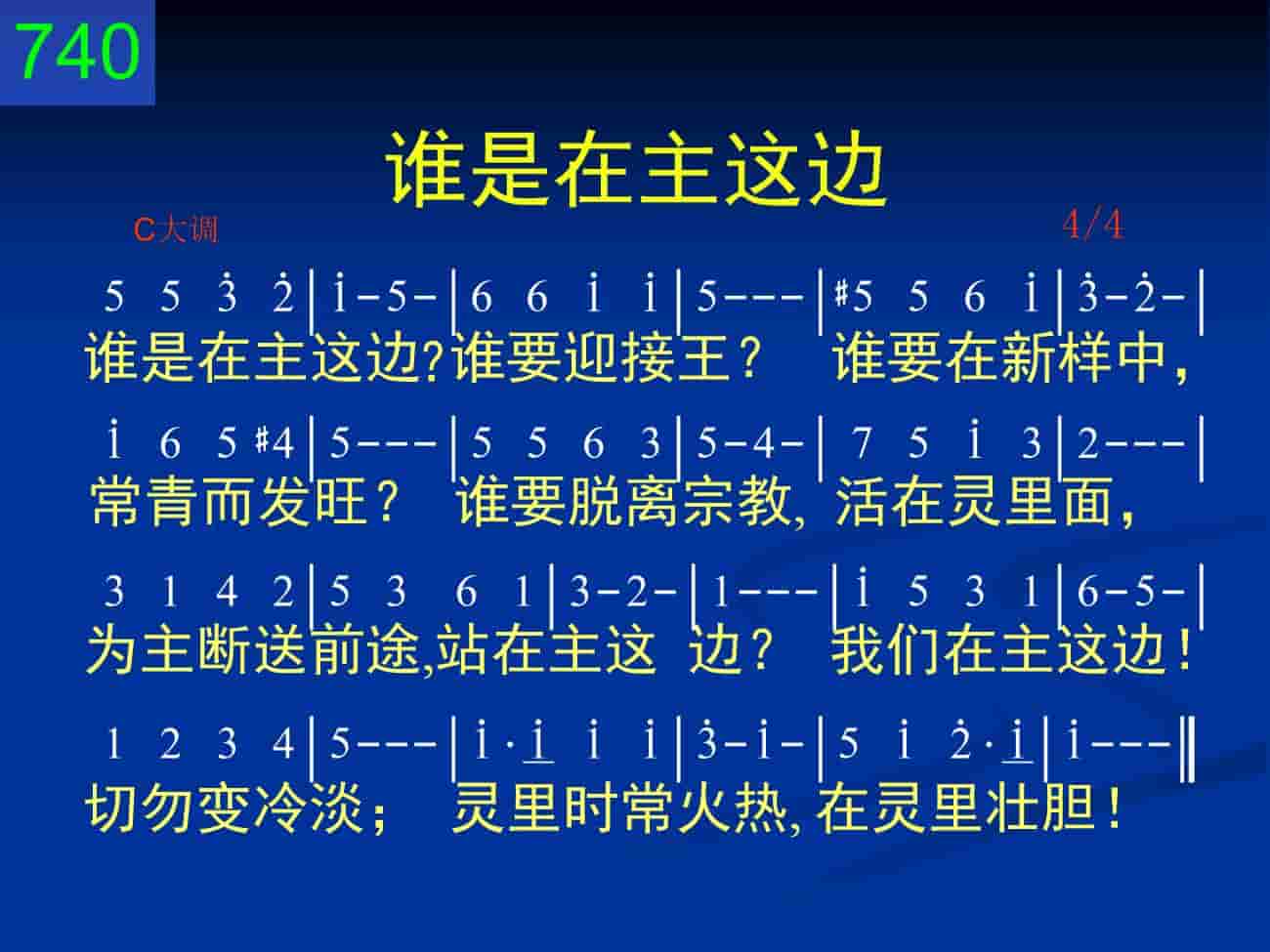 谁是在主这边?谁要迎接王?谁要在新样中,常青而发旺?谁要脱离宗教,活在灵里面,为主断送前途,站在主这边?我们在主这边!切勿变冷淡;灵里时常火热,在灵里壮胆!