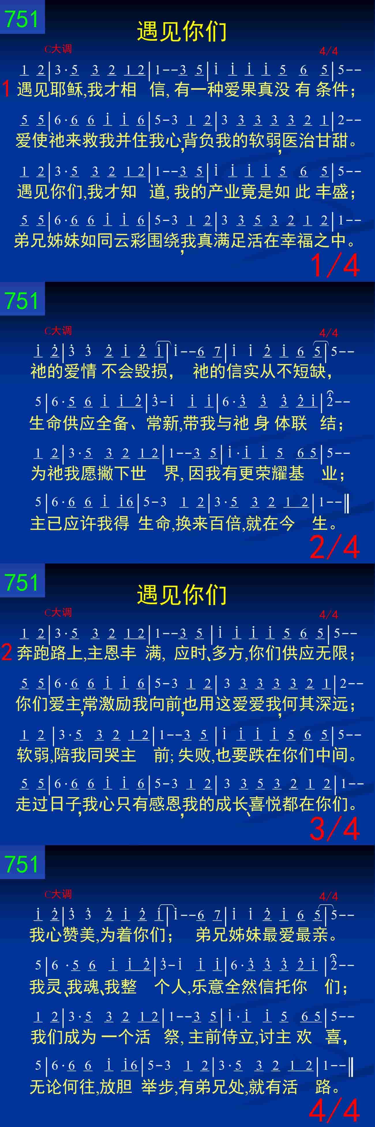 遇见耶稣,我才相信,有一种爱果真没有条件;爱使祂来救我并住我心,背负我的软弱,医治甘甜。遇见你们,我才知道,我的产业竟是如此丰盛;弟兄姊妹如同云彩围绕,我真满足活在幸福之中。祂的爱情不会毁损,祂的信实从不短缺,生命供应全备、常新,带我与祂身体联结;为祂我愿撇下世界,因我有更荣耀基业;主已应许我得生命,换来百倍,就在今生。