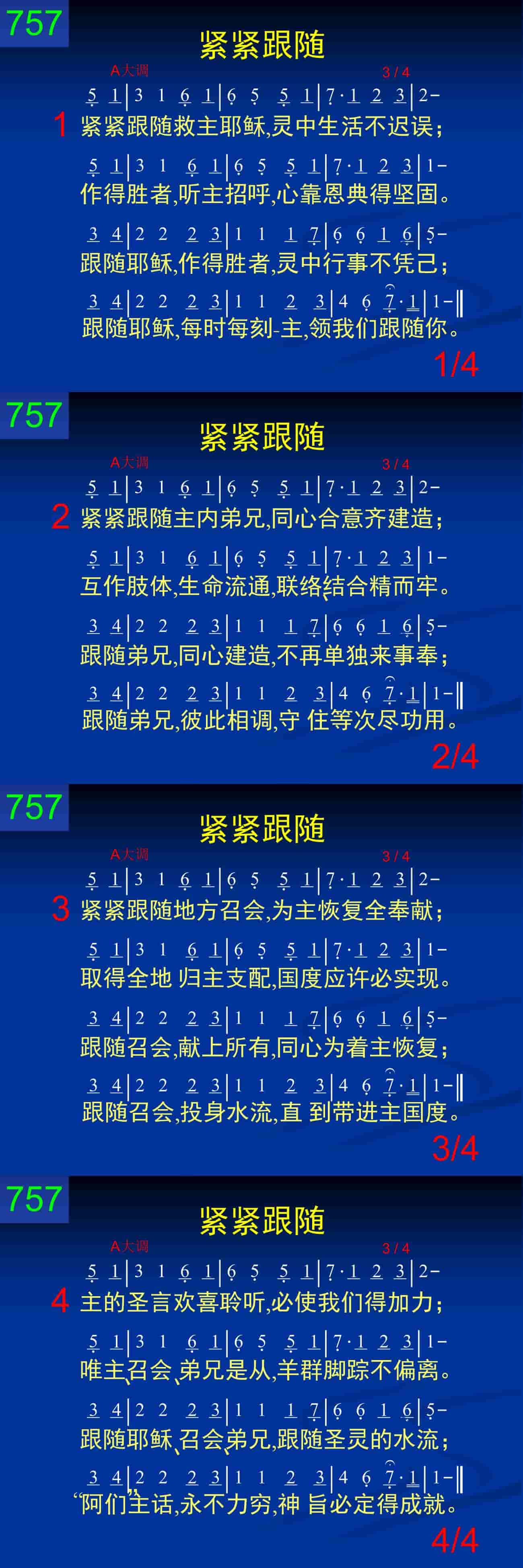 紧紧跟随救主耶稣,灵中生活不迟误;作得胜者,听主招呼,心靠恩典得坚固。跟随耶稣,作得胜者灵中行事不凭己;跟随耶稣,每时每刻——主,领我们跟随你。