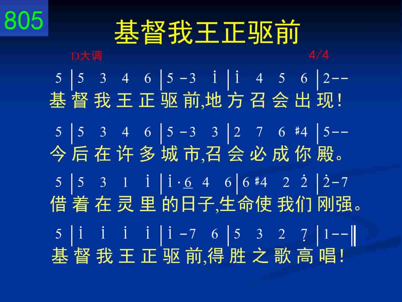 基督我王正驱前,地方召会出现!今后在许多城市,召会必成你殿。借着在灵里的日子,生命使我们刚强。基督我王正驱前,得胜之歌高唱!