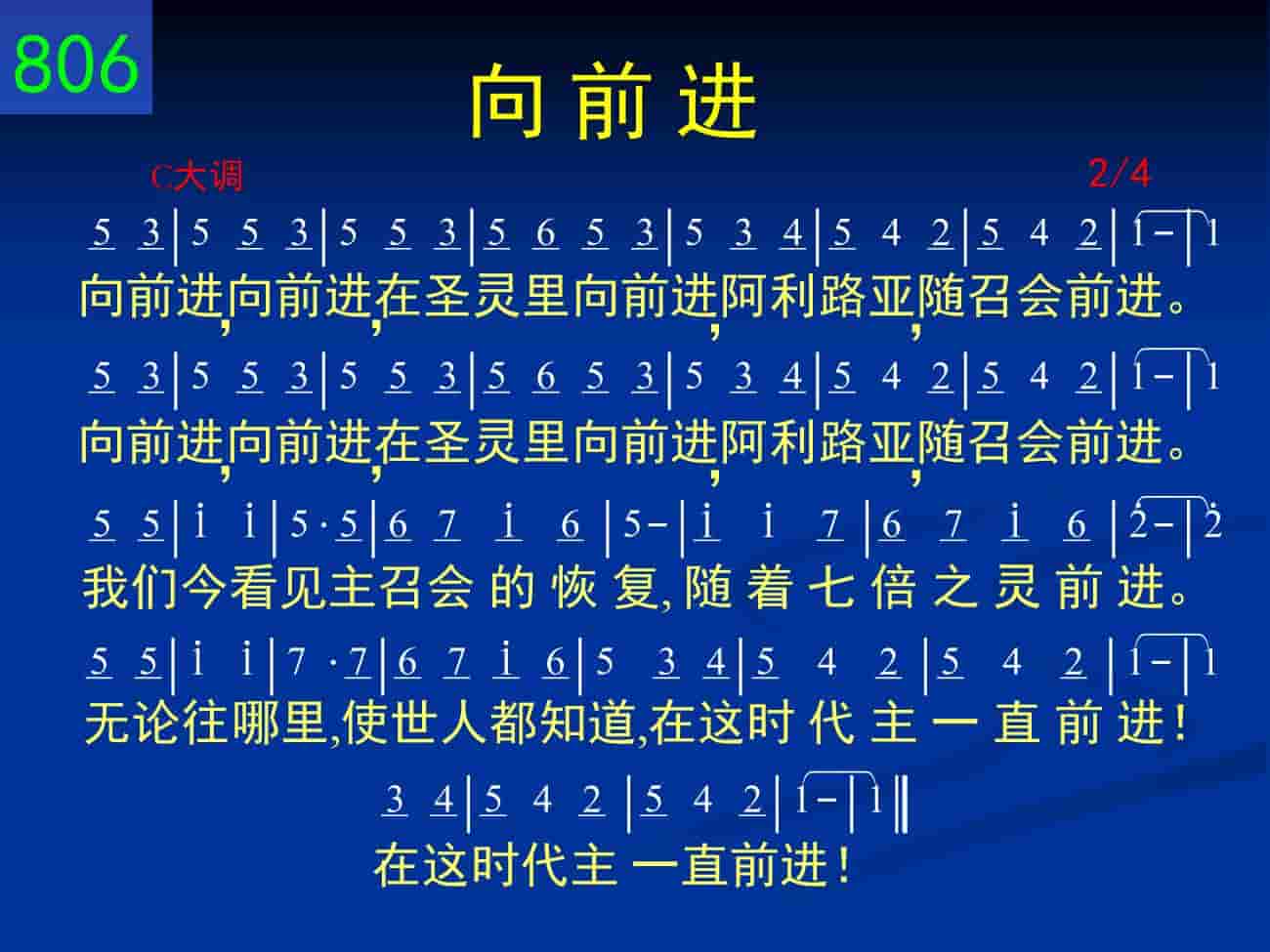 向前进,向前进,在圣灵里向前进,阿利路亚,随召会前进。我们今看见主召会的恢复,随着七倍之灵前进。无论往那里,使世人都知道,在这时代主一直前进!在这时代主,一直前进!