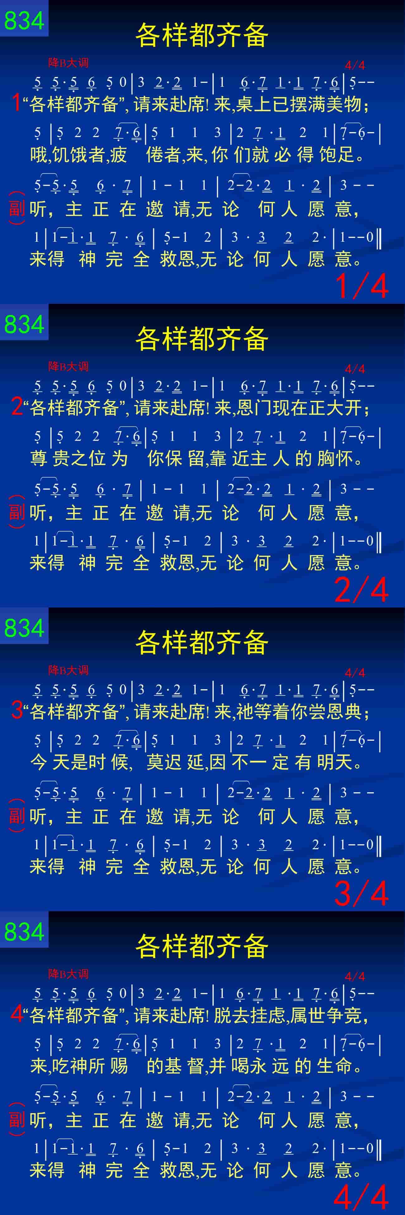 “各样都齐备”,请来赴席!来,桌上已摆满美物;哦,饥饿者,疲倦者,来,你们就必得饱足。