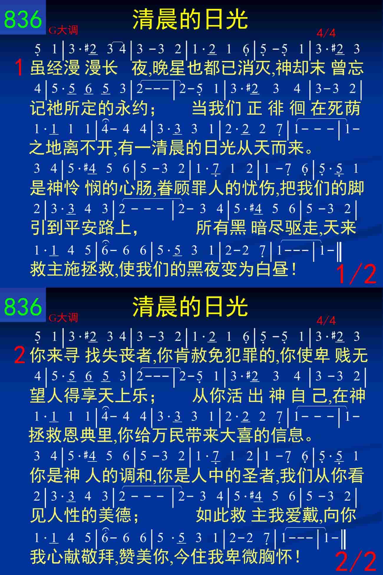 虽经漫漫长夜,晚星也都已消灭,神却末曾忘记祂所定的永约;当我们正徘徊在死荫之地离不开,有一清晨的日光从天而来。是神怜悯的心肠,眷顾罪人的忧伤,把我们的脚引到平安路上,所有黑暗尽驱走,天来救主施拯救,使我们的黑夜变为白昼!