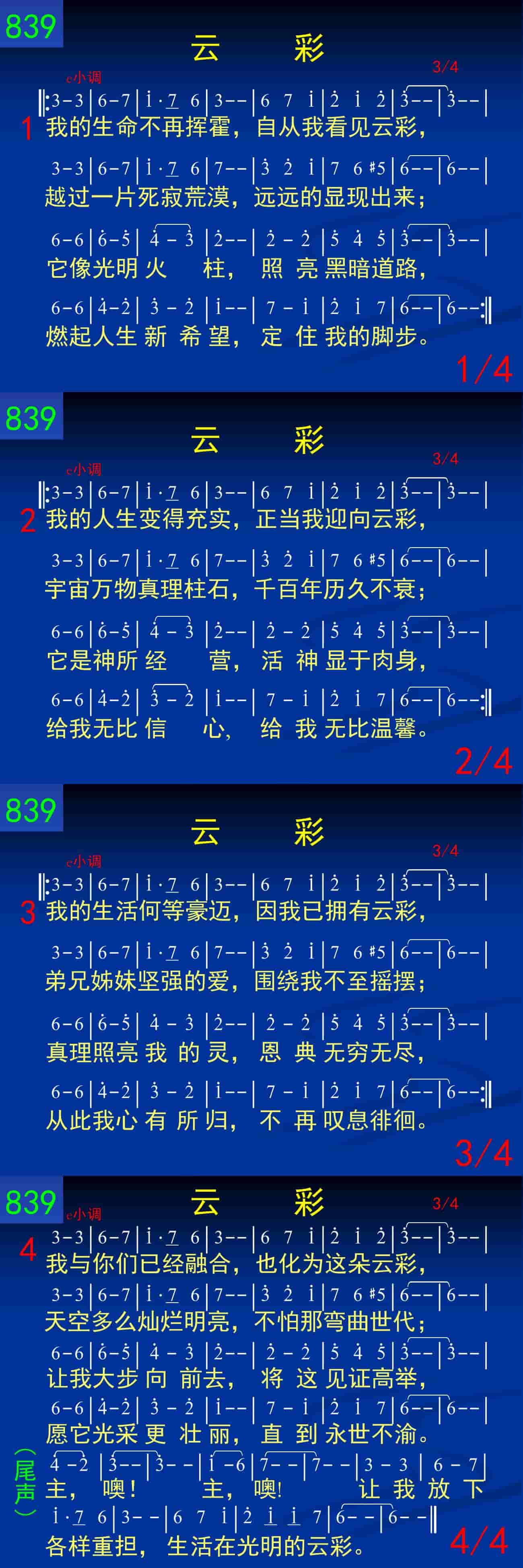 我与你们已经融合,也化为这朵云彩,天空多么灿烂明亮,不怕那弯曲世代;让我大步向前去,将这见证高举,愿它光采更壮丽,直到永世不渝。(尾声)主,噢!主,噢!让我放下各样重担,生活在光明的云彩。