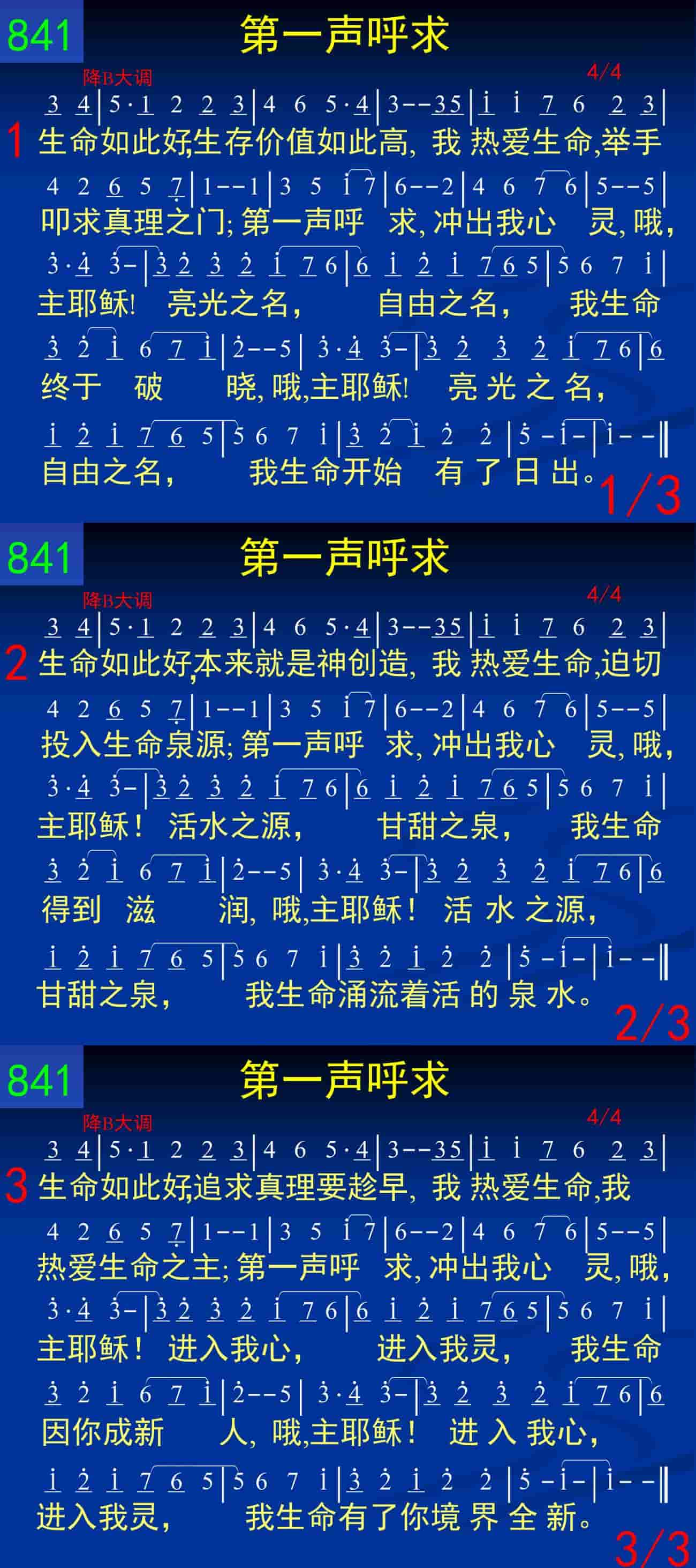 生命如此好,追求真理要趁早,我热爱生命,我热爱生命之主;第一声呼求,冲出我心灵,哦,主耶稣!进入我心,进入我灵,我生命因你成新人,哦,主耶稣!进入我心,进入我灵,我生命有了你境界全新。