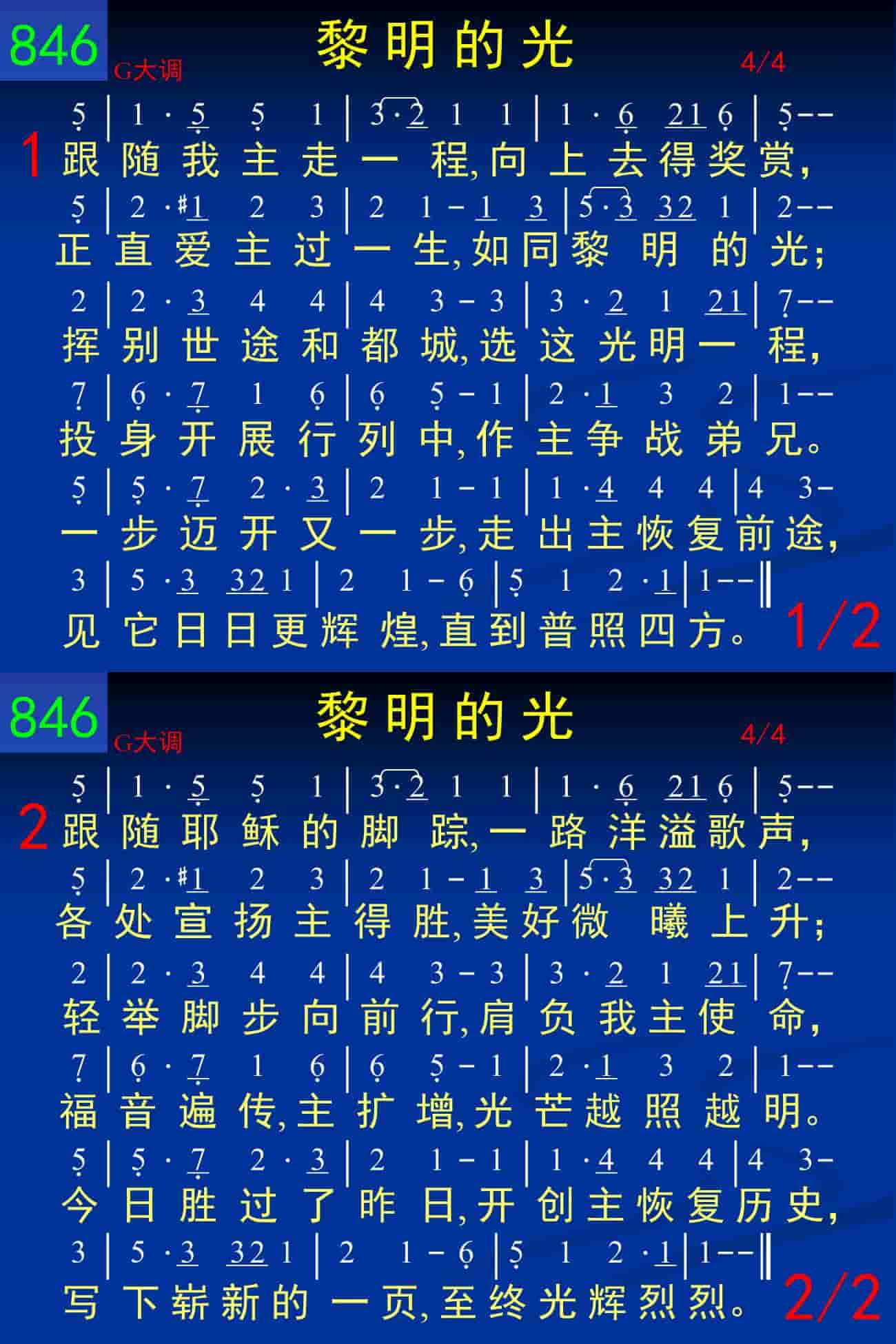 跟随耶稣的脚踪,一路洋溢歌声,各处宣扬主得胜,美好微曦上升;轻举脚步向前行,肩负我主使命,福音遍传,主扩增,光芒越照越明。今日胜过了昨日,开创主恢复历史,写下崭新的一页,至终光辉烈烈。