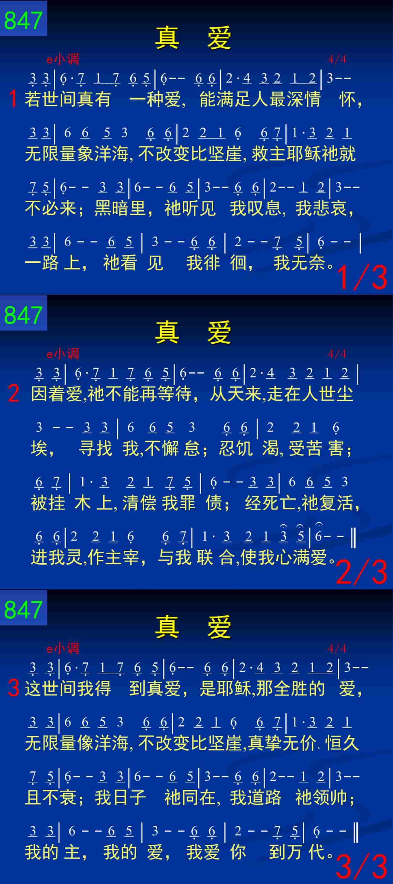 这世间我得到真爱,是耶稣,那全胜的爱,无限量像洋海,不改变比坚崖,真挚、无价、恒久且不衰;我日子祂同在,我道路祂领帅;我的主,我的爱,我爱你到万代。