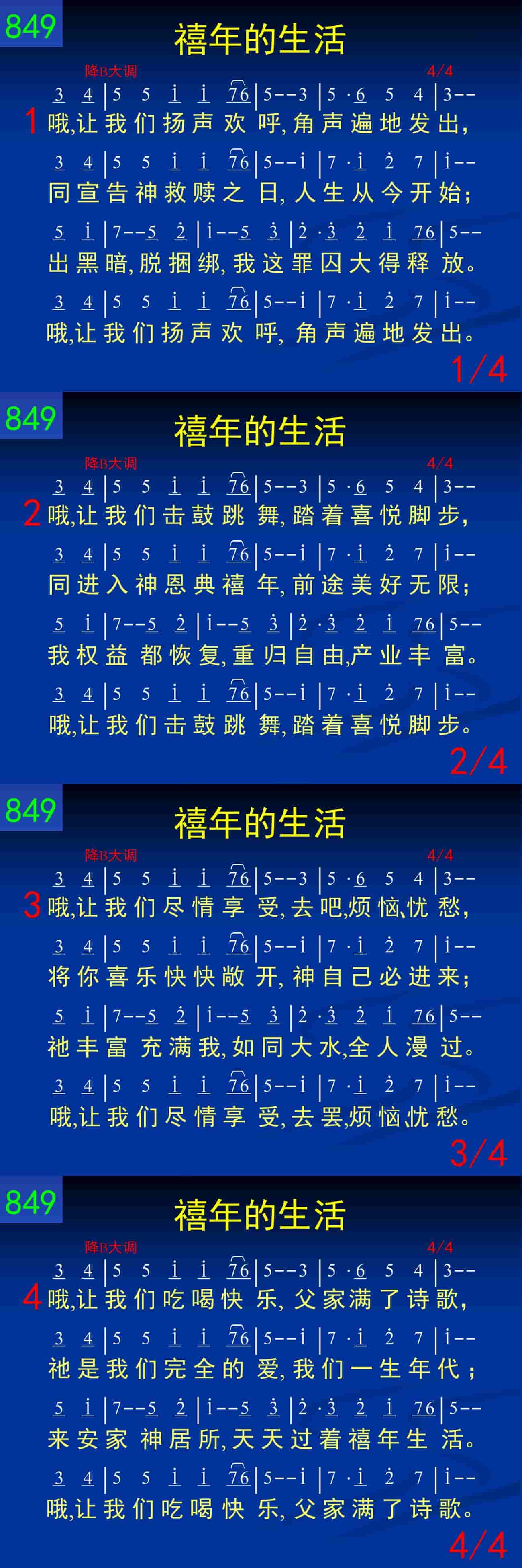 哦,让我们吃喝快乐,父家满了诗歌,祂是我们完全的爱,我们一生年代;来安家神居所,天天过着禧年生活。哦,让我们吃喝快乐,父家满了诗歌。