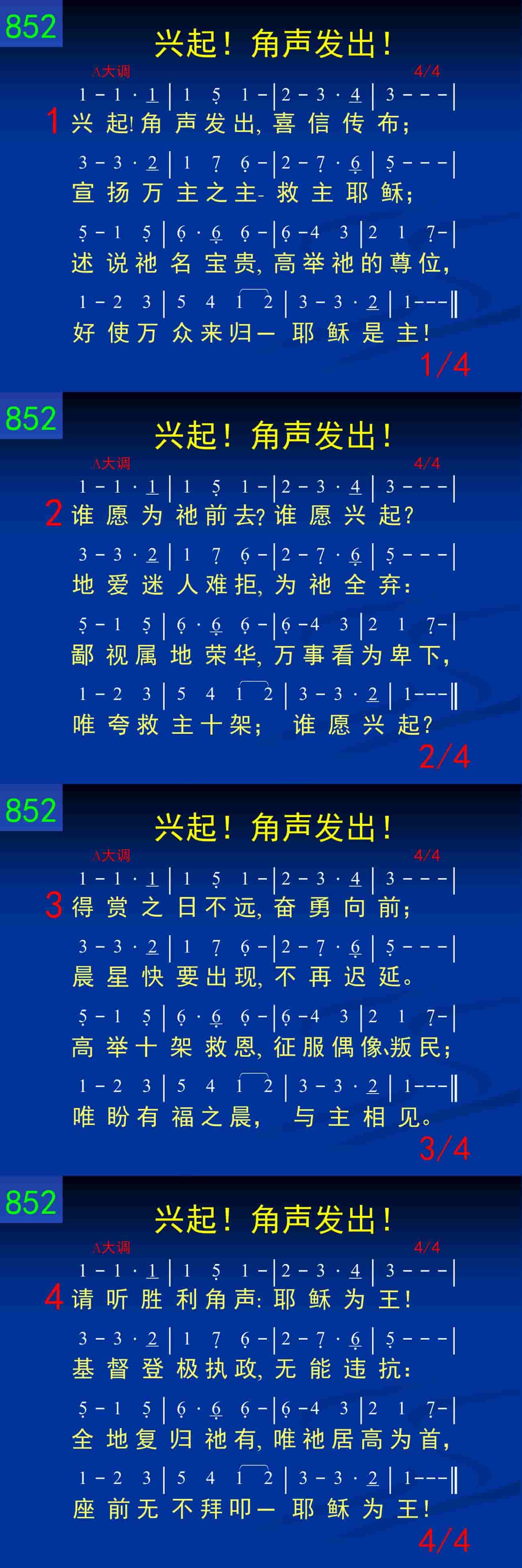 兴起!角声发出,喜信传布;宣扬万主之主——救主耶稣;述说祂名宝贵,高举祂的尊位,好使万众来归——耶稣是主!