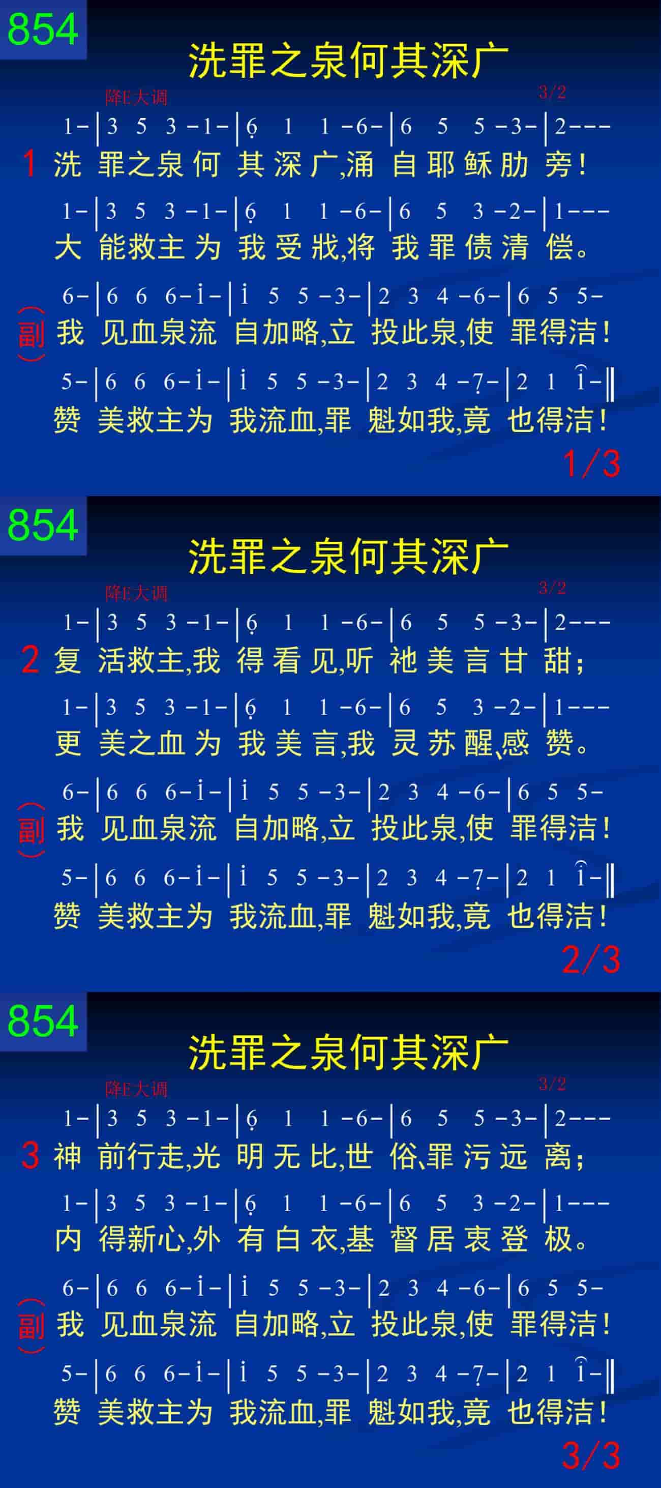 洗罪之泉何其深广,涌自耶稣肋旁!大能救主为我受戕,我罪清偿。