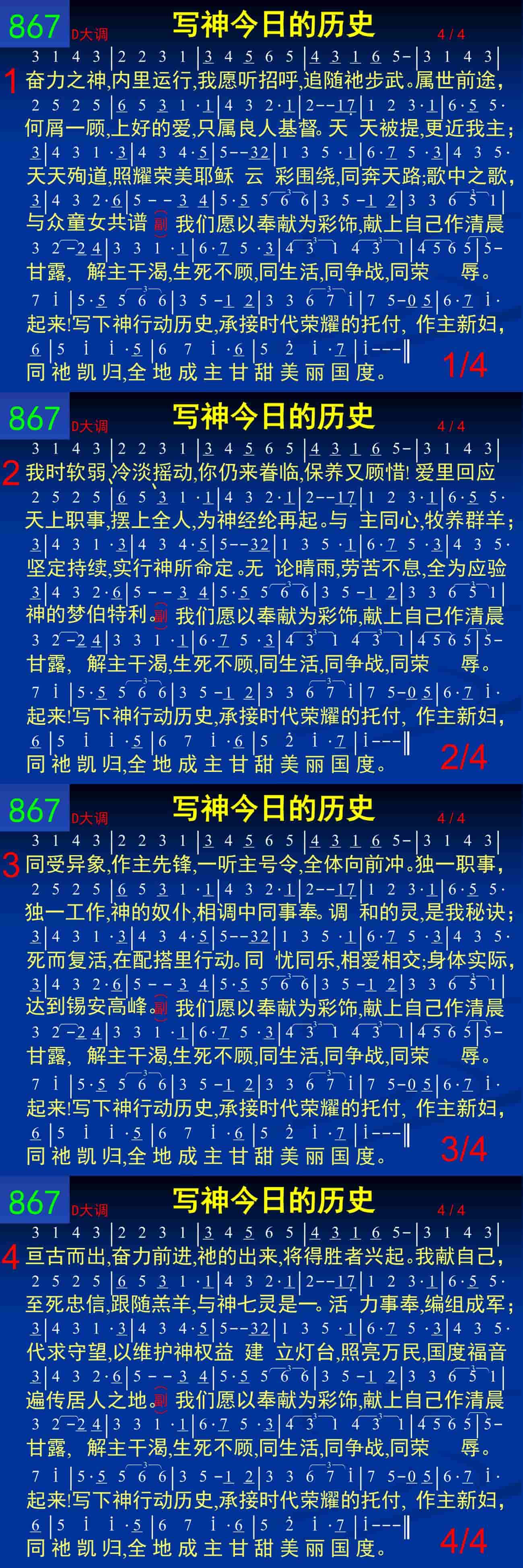 奋力之神,内里运行,我愿听招呼,追随祂步武。属世前途,何屑一顾,上好的爱,只属良人基督。天天被提,更近我主;天天殉道,照耀荣美耶稣。云彩围绕,同奔天路;歌中之歌,与众童女共谱。