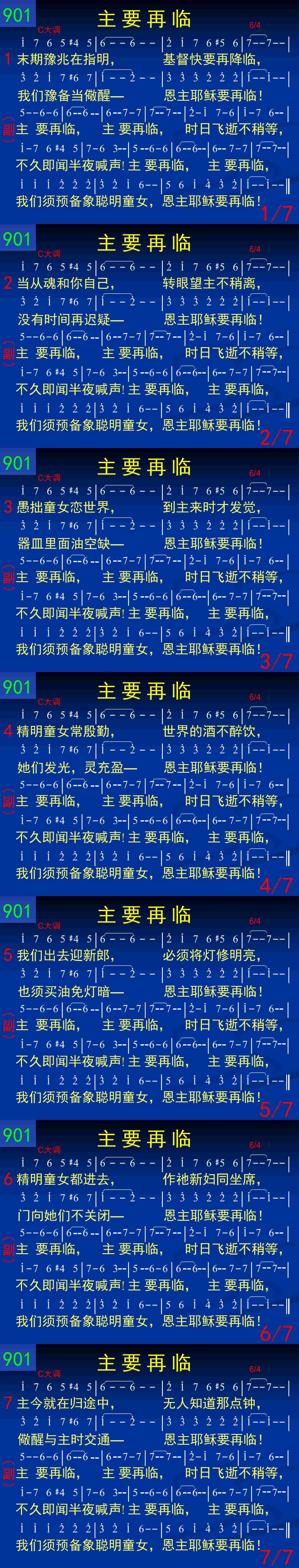 主要再临,主要再临,时间飞逝不稍等,不久即闻半夜喊声!主要再临,主要再临,我们须预备像聪明童女,恩主耶稣要再临!