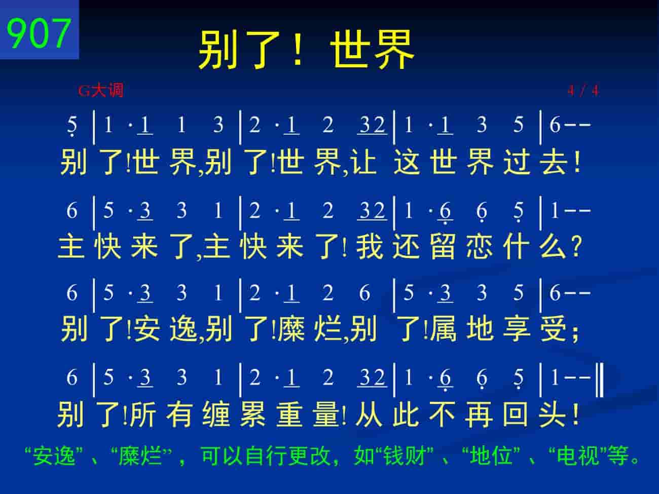 别了!世界,别了!世界,让这世界过去!主快来了,主快来了!我还留恋什么?别了!安逸,别了!糜烂,别了!属地享受;别了!所有缠累重量!从此不再回头!