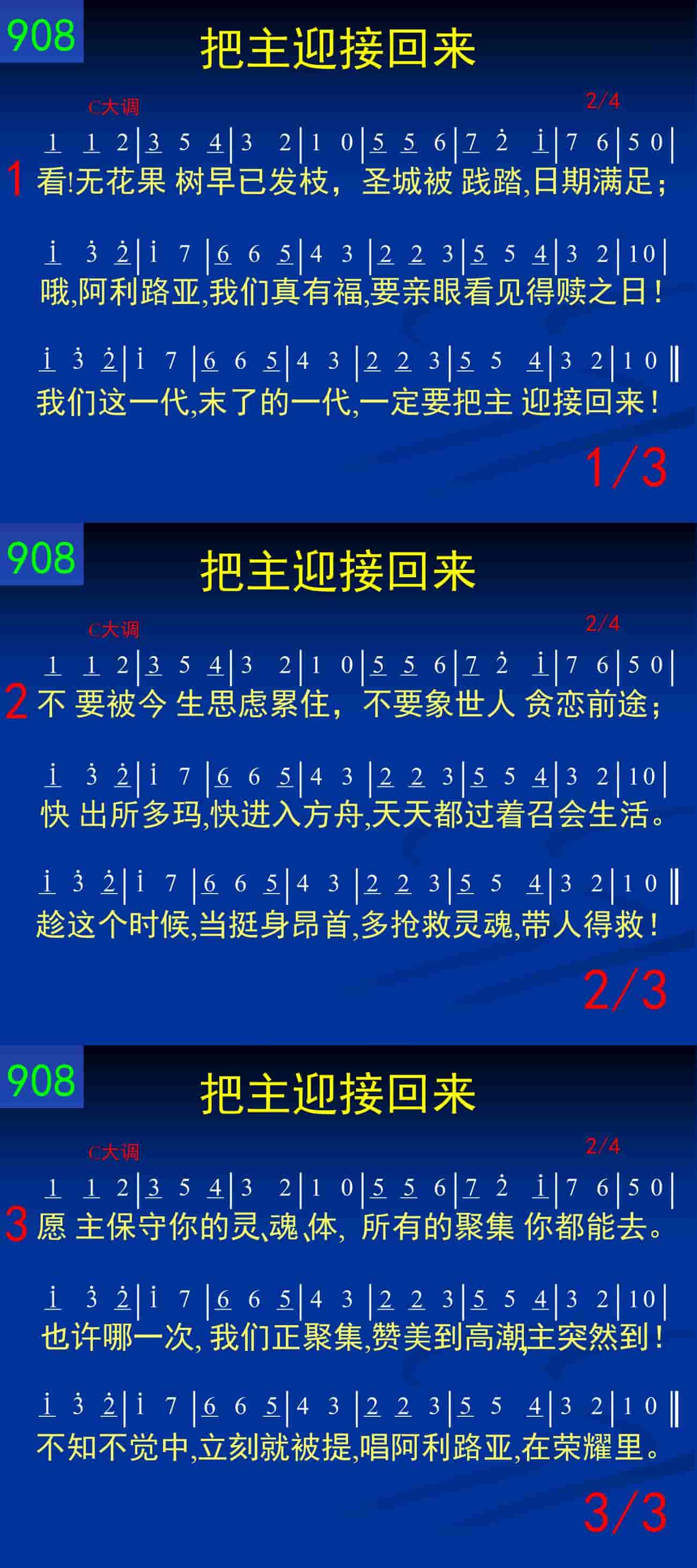 看!无花果树早已发枝,圣城被践踏,日期满足;哦,阿利路亚,我们真有福,要亲眼看见得赎之日!我们这一代,末了的一代,一定要把主迎接回来!