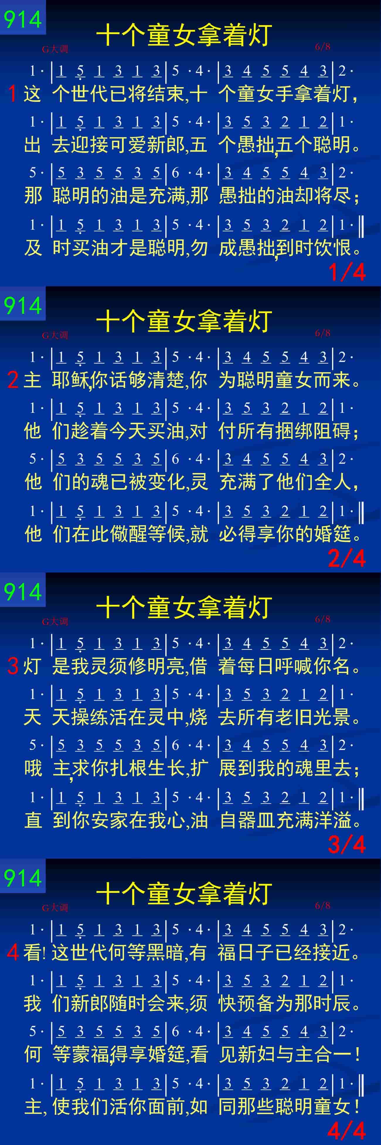 看!这世代何等黑暗,有福日子已经接近。我们新郎随时会来,须快预备为那时辰。何等蒙福,得享婚筵,看见新妇与主合一!主,使我们活你面前,如同那些聪明童女!