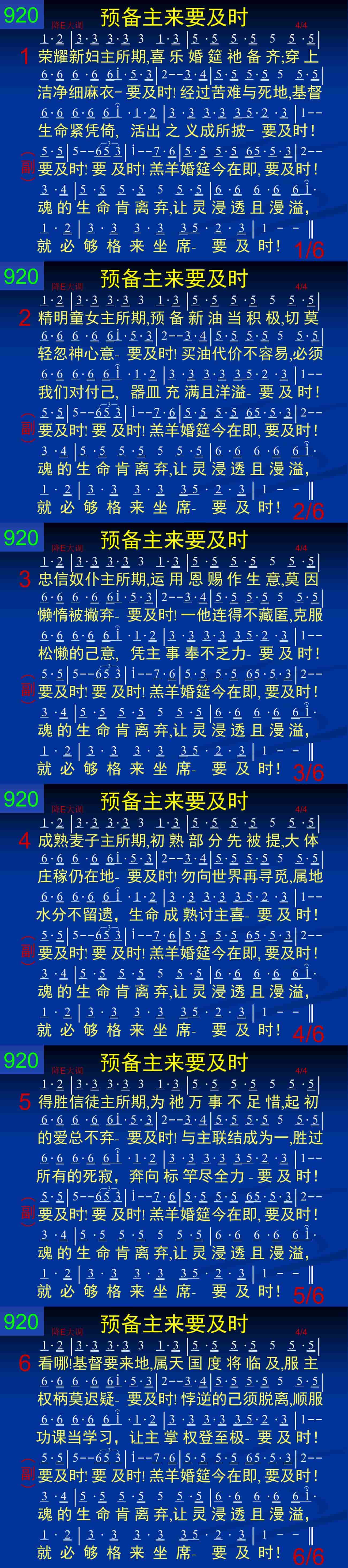 荣耀新妇主所期,喜乐婚筵祂备齐;穿上洁净细麻衣——要及时!经过苦难与死地,基都生命紧凭倚,活出之义成所披——要及时!