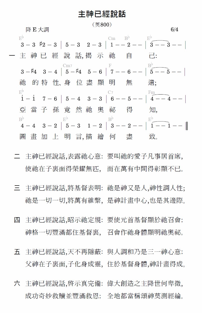 主神已经说话,启示真完备:伟大创造之主降世何卑微,成功奇妙救赎并丰满救恩;全地都当称颂神莫测经纶。