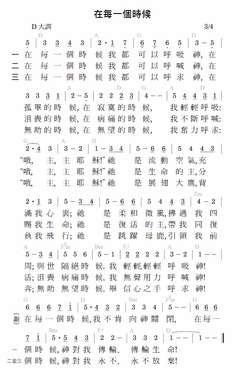 在每一个时候我都可以呼吸神,在孤单的时候,在寂寞的时候,我轻轻呼吸:“哦,主,主耶稣!”祂是流动空气,充满我心里;祂是柔和微风,拂过我四周;与世隔绝时候,我轻轻、轻轻呼吸神!