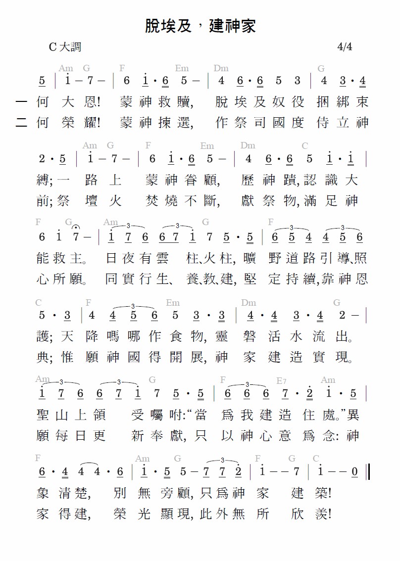 何大恩!蒙神救赎,脱埃及奴役捆绑束缚;一路上蒙神眷顾,历神迹,认识大能救主。日夜有云柱、火柱,旷野道路引导、照护;天降吗哪作食物,灵磐活水流出。圣山上领受嘱咐:“当为我建造住处。”异象清楚,别无旁顾,只为神家建筑!