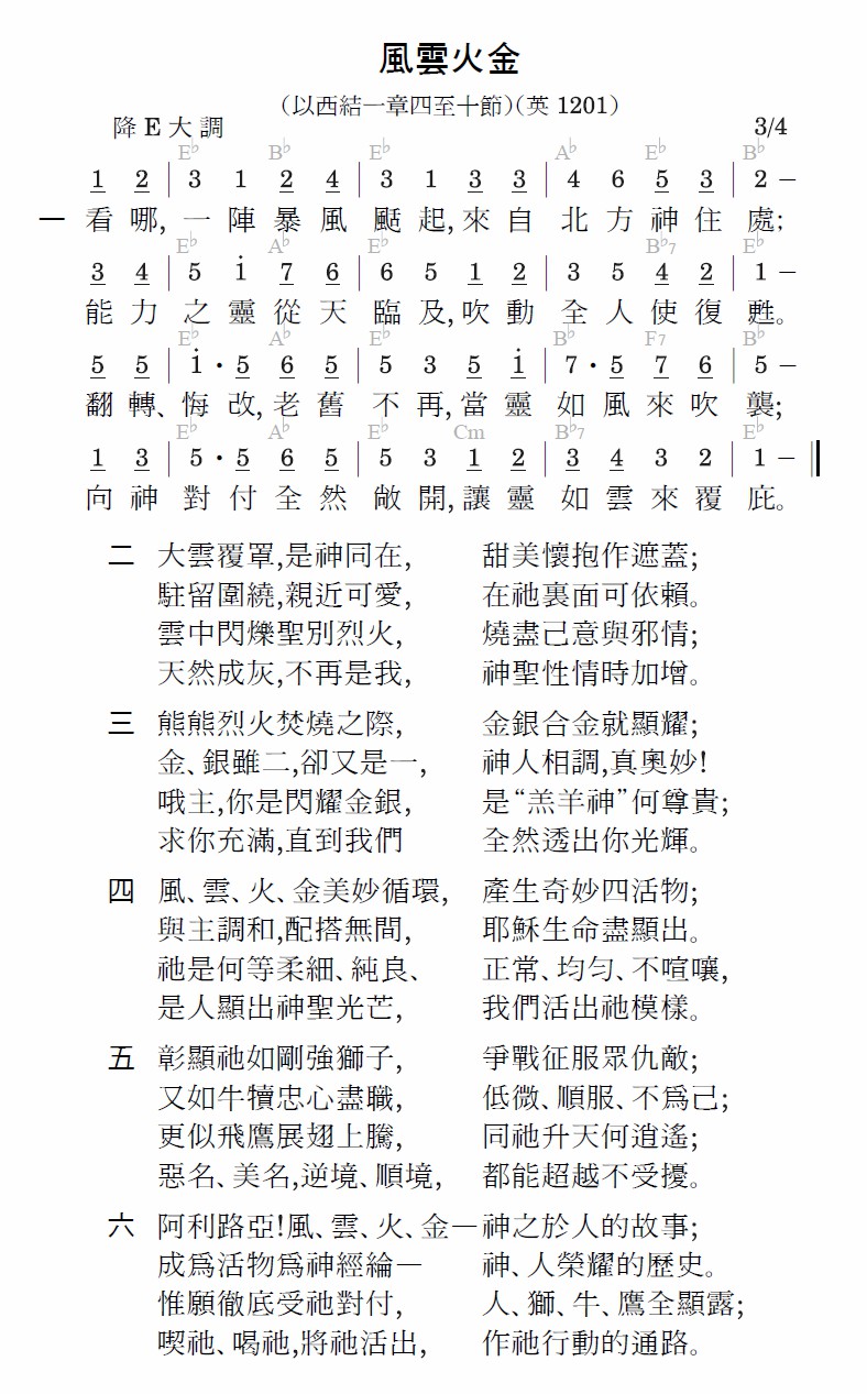 风、云、火、金美妙循环,产生奇妙四活物;与主调和,配搭无间,耶稣生命尽显出。祂是何等柔细、纯良、正常、均匀、不喧嚷,是人显出神圣光芒,我们活出祂模样。
