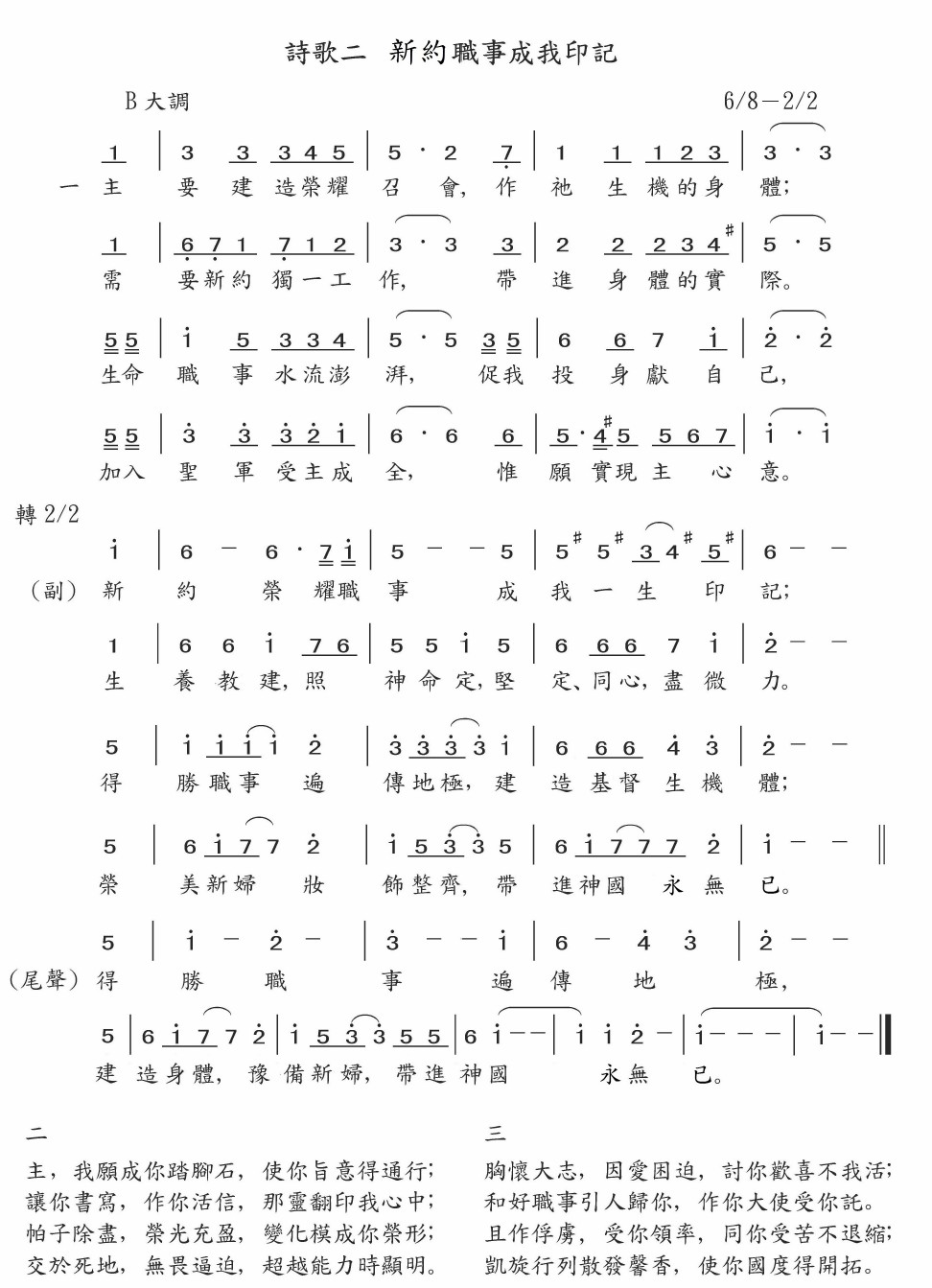 新约荣耀职事成我一生印记;生养教建照神命定,坚定、同心尽微力。得胜职事遍传地极,建造基督生机体;荣美新妇妆饰整齐,带进神国永无已。