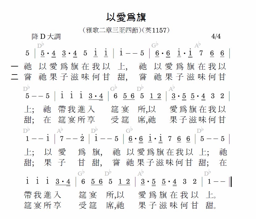 祂以爱为旗在我以上,祂以爱为旗在我以上;祂带我进入筵宴所,以爱为旗在我以上;以爱为旗,祂以爱为旗在我以上;祂带我进入筵宴所,以爱为旗在我以上。