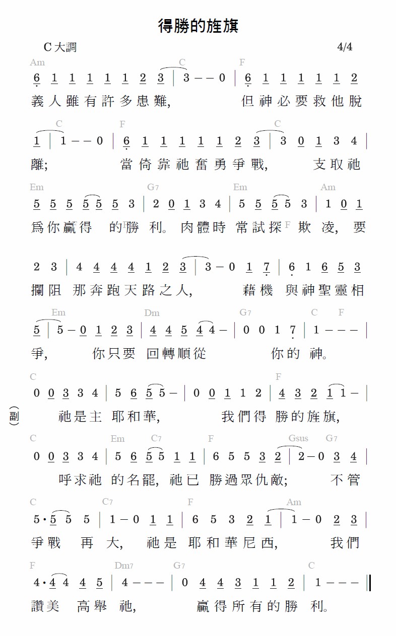 祂是主耶和华,我们得胜的旌旗,呼求祂的名吧,祂已胜过众仇敌;不管争战再大,祂是耶和华尼西,我们赞美高举祂,赢得所有的胜利。