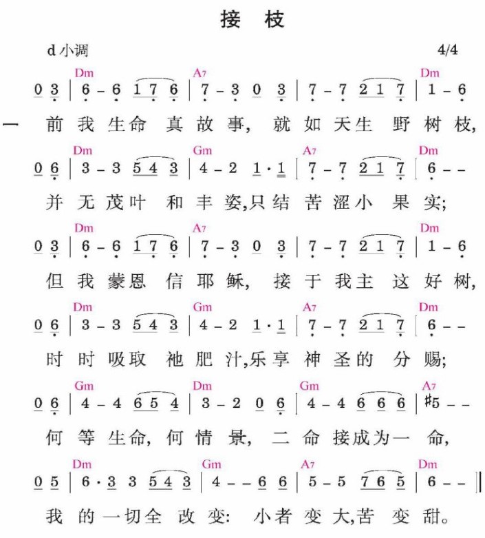 前我生命真故事,就如天生野树枝,并无茂叶和丰姿,只结苦涩小果实;但我蒙恩信耶稣,接于我主这好树,时时吸取祂肥汁,乐享神圣的分赐;何等生命,何情景,二命接成为一命,我的一切全改变:小者变大,苦变甜。