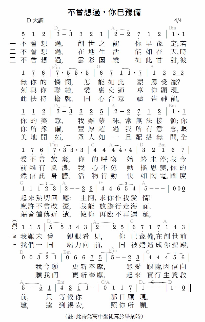 不曾想过,在地生活能如在天,时刻与你联结,爱里交通享你显现。你所预备,丰厚超过我所有意念,眼前虽有风浪,我心不免动摇思变,你的应许不曾改迁,我能放胆行走海面。