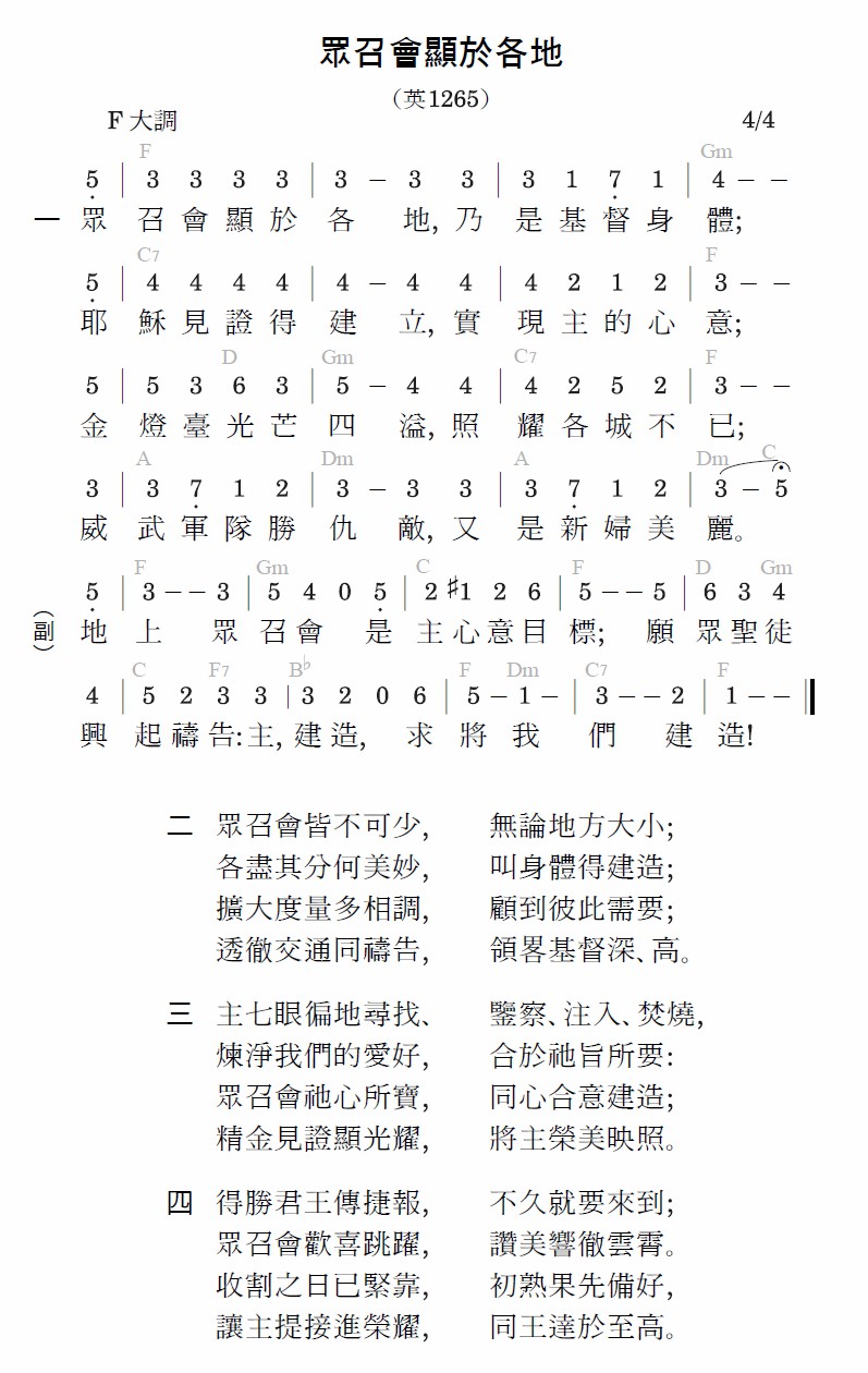 众召会显于各地,乃是基督身体;耶稣见证得建立,实现主的心意;金灯台光芒四溢,照耀各城不已;威武军队胜仇敌,又是新妇美丽。