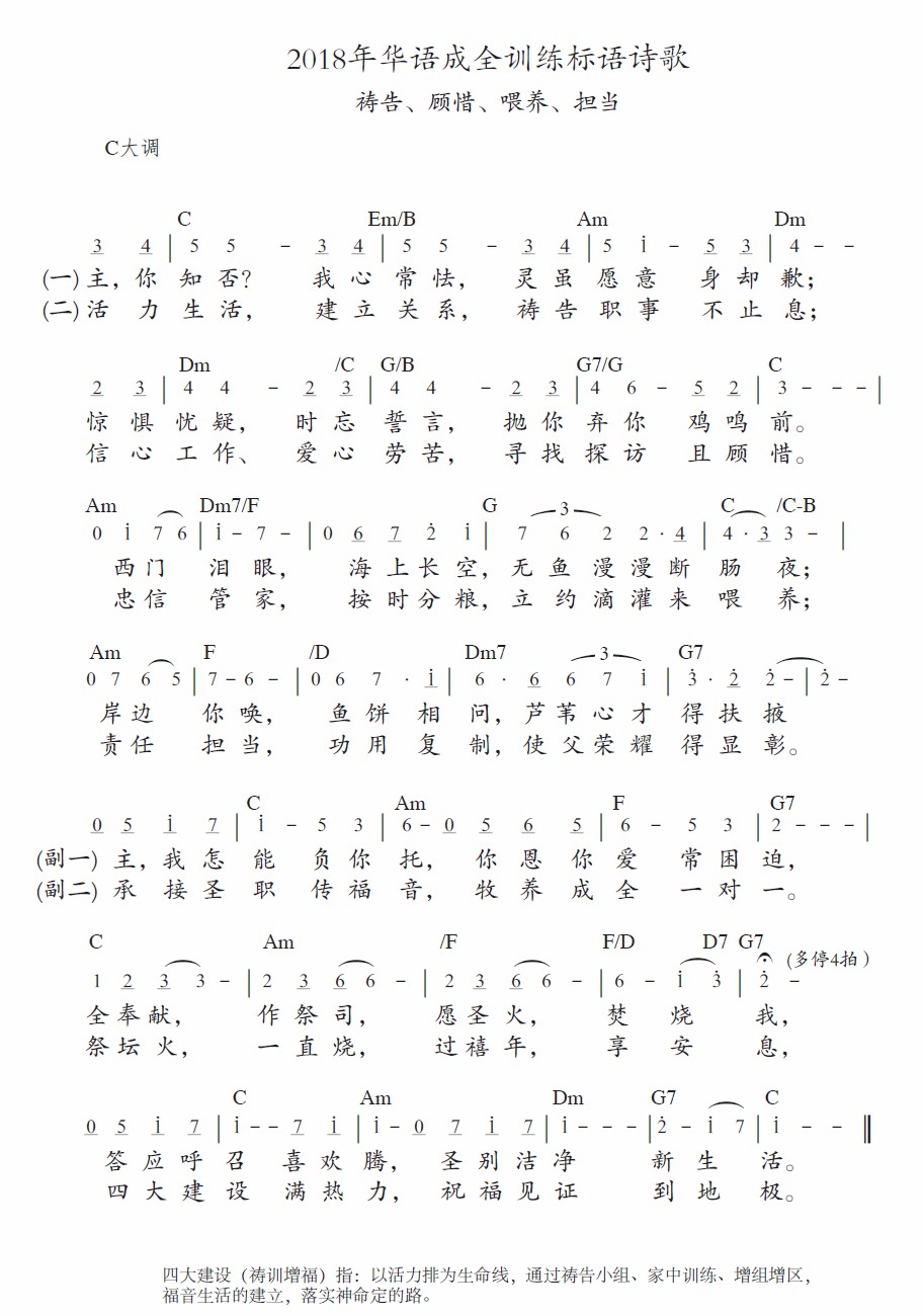 活力生活,建立关系,祷告职事不止息;信心工作、爱心劳苦,寻找探访且顾惜。忠信管家,按时分粮,立约滴灌来喂养;责任担当,功用复制,使父荣耀得显彰。