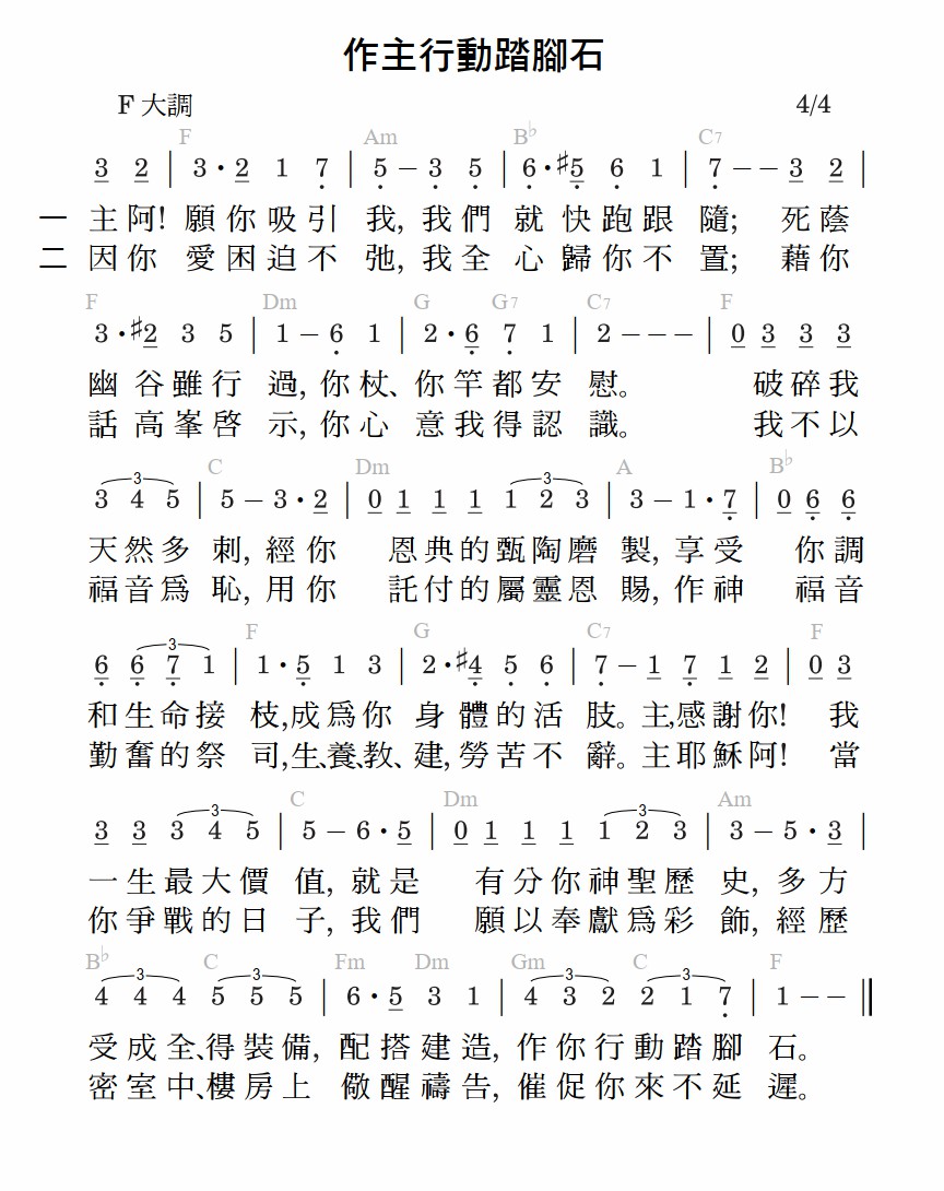 因你爱困迫不弛,我全心归你不置;借你话高峰启示,你心意我得认识。我不以福音为耻,用你托付的属灵恩赐,作神福音勤奋的祭司,生、养、教、建,劳苦不辞。主耶稣阿!当你争战的日子,我们愿以奉献为彩饰,经历密室中、楼房上儆醒祷告催促你来不延迟。