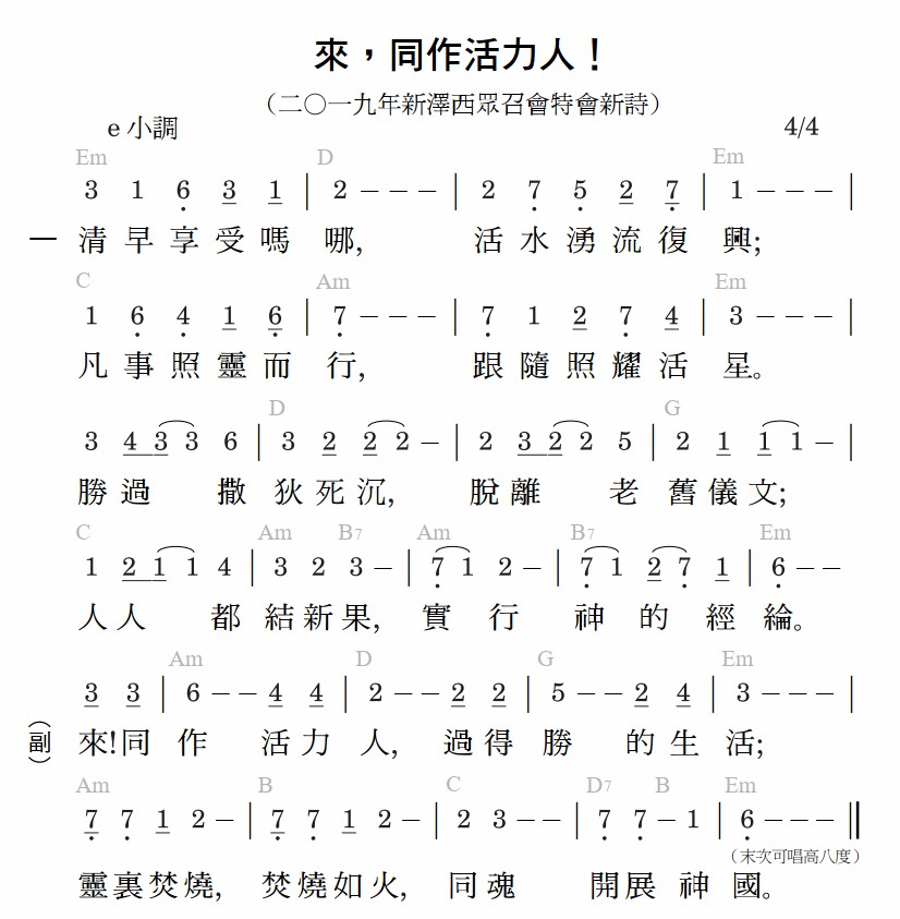 来!同作活力人,传人生的奥秘;天天传扬,传扬福音,争战得着美地。