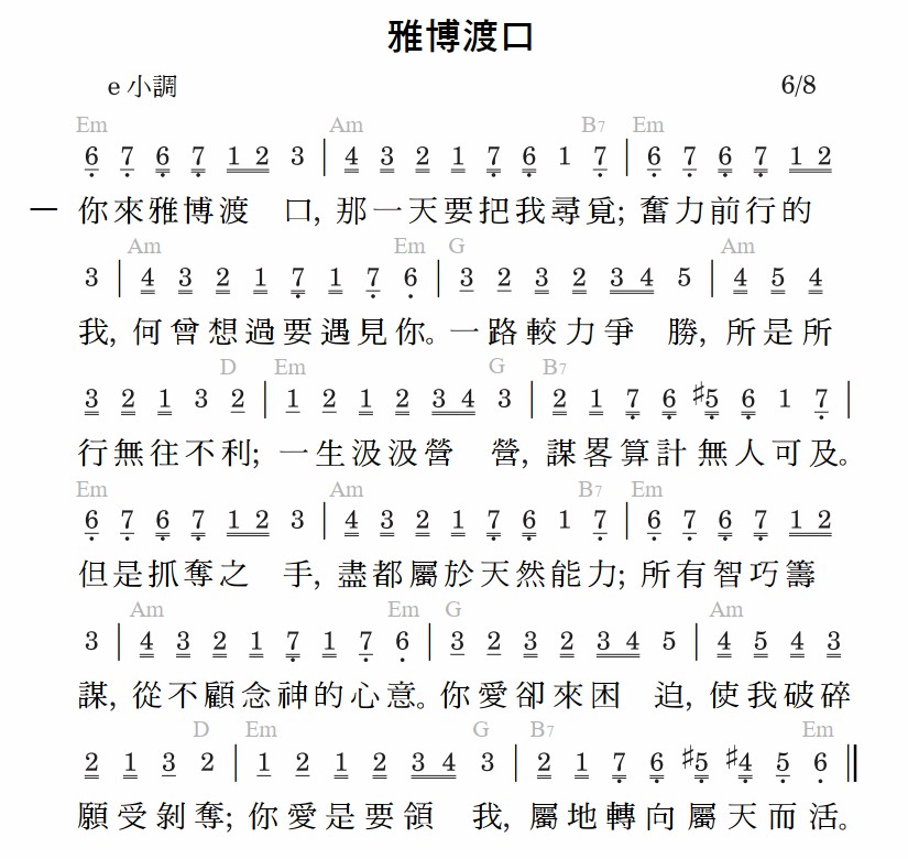 我在雅博渡口,那一夜里遇见了你;一直同在的神,从来没有与我远离。顽强自私如我,一生强要与你争斗;恩典怜悯的你;却是要我走过隘口。我不放你过去,缠斗整夜直到黎明;你却伸出爱手,使我勇壮变为瘸行。终于日头升起,我面对面看见了你;终于渡口过去,你已彻底衰颓我力。