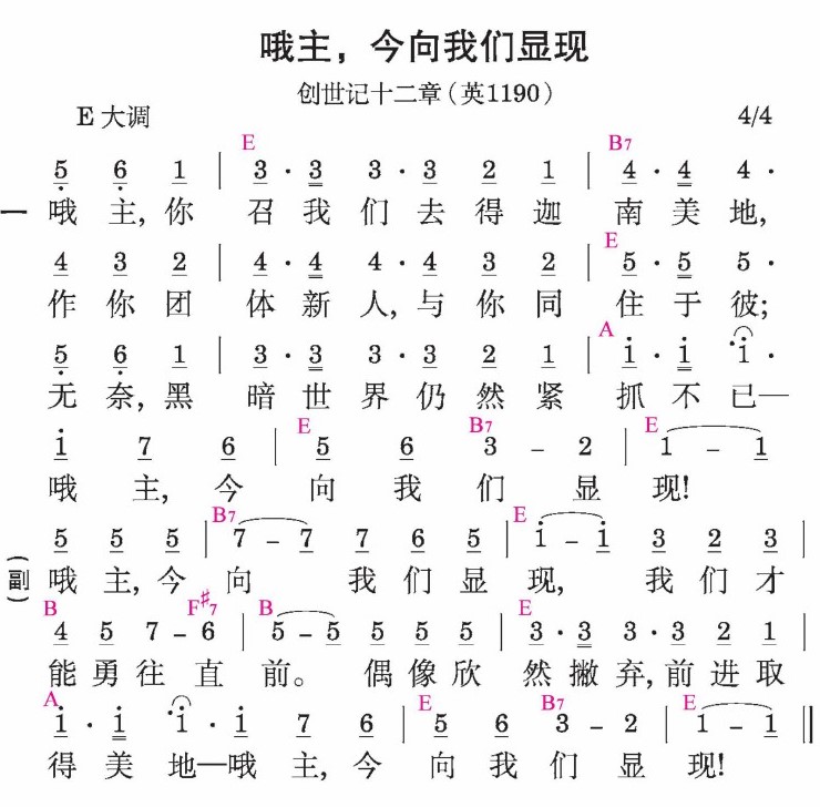 哦主,你召我们去得迦南美地,作你团体新人,与你同住于彼;无奈,黑暗世界仍然紧抓不已—哦主,今向我们显现!