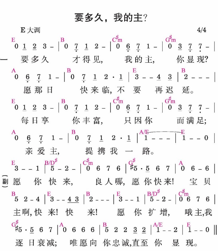 要多久才得见,我的主,你显现?愿那日快来临,不要再迟延。每日享你丰富,只因你而满足;亲爱主,提携我一路。