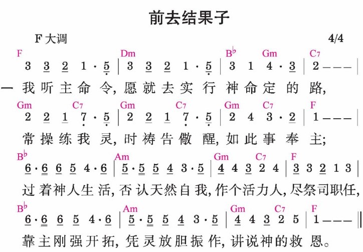 我因爱困迫,答应主所托,实行活力排,这是我工作,也是我生活,把主传播开;只要持续去作,一定会有收获,前去结果子,挽回神浪子,神人同乐唱说,我也一样快活,有何满足如此。