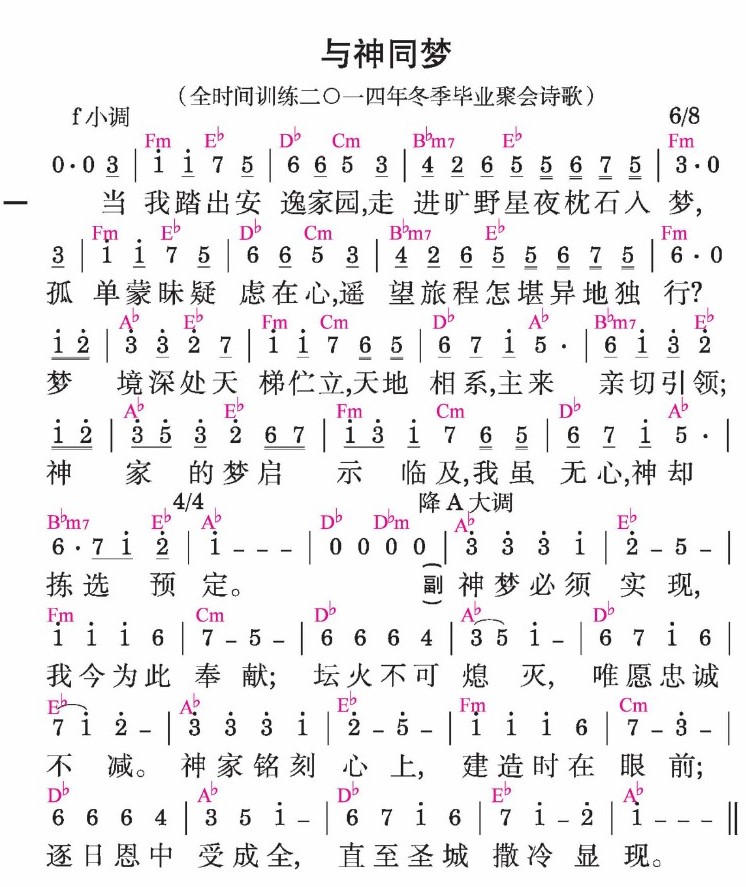 神梦必须实现,我今为此奉献;坛火不可熄灭,唯愿忠诚不减。神家铭刻心上,建造时在眼前;逐日恩中受成全,直至圣城撒冷显现。