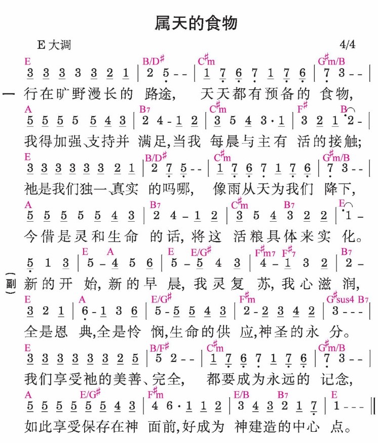 行在旷野漫长的路途,天天都有预备的食物,我得加强、支持并满足,当我每晨与主有活的接触;祂是我们独一、真实的吗哪,像雨从天为我们降下,今借是灵和生命的话,将这活粮具体来实化。
