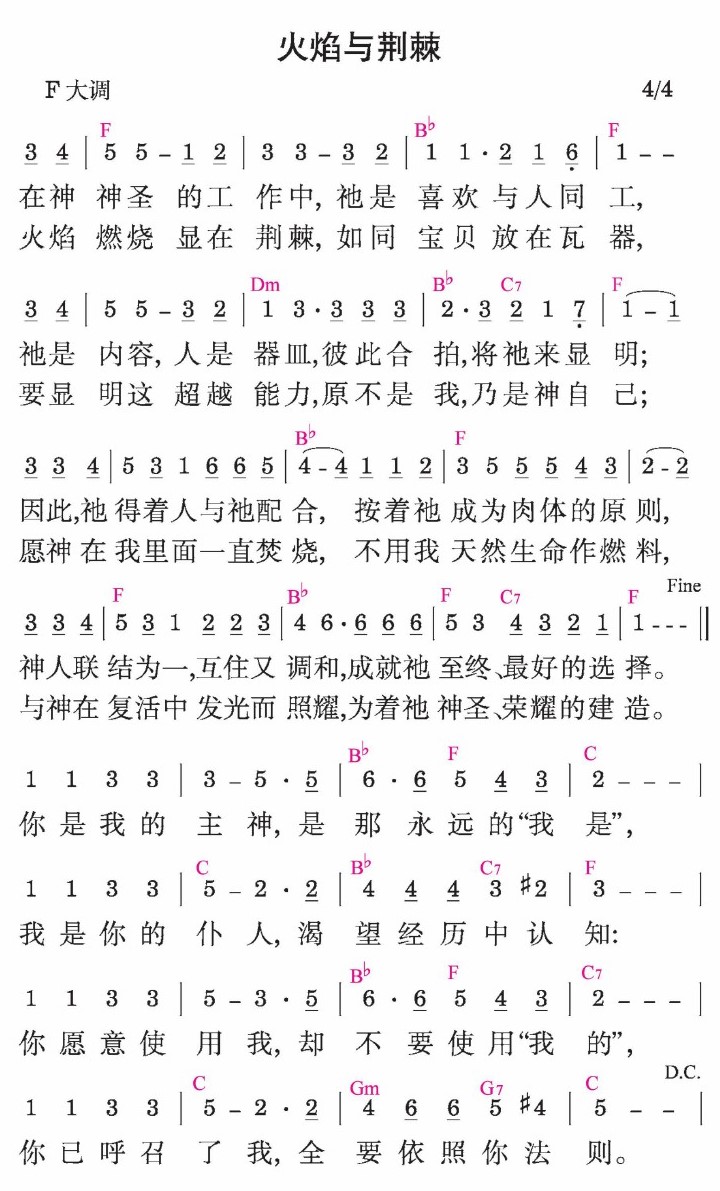 在神神圣的工作中,祂是喜欢与人同工,祂是内容,人是器皿,彼此合拍将祂来显明;因此,祂得着人与祂配合,按着祂成为肉体的原则,神人联结为一,互住又调和,成就祂至终、最好的选择。你是我的主神,是那永远的“我是”,我是你的仆人,渴望经历中认知:你愿意使用我,却不要使用“我的”,你已呼召了我,全要依照你法则。火焰燃烧显在荆棘,如同宝贝放在瓦器,要显明这超越能力,原不是我,乃是神自己;愿神在我里面一直焚烧,不用我天然生命作燃料,与神在复活中发光而照耀,为着祂神圣、荣耀的建造。